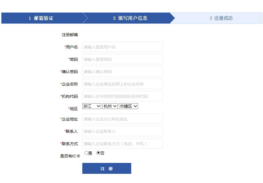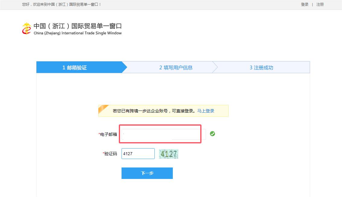 (3)填写注册信息。持原三证的用户需填写组织机构代码,三证合一的用户请填写社会信用代码。若提示企业已注册,可使用原有浙江电子口岸或宁波电子口岸账号登录单一窗口平台。若显示企业信息被占用但未注册,请及时联系客服:浙江用户致电0571-967209,宁波用户致电0574-89099000。